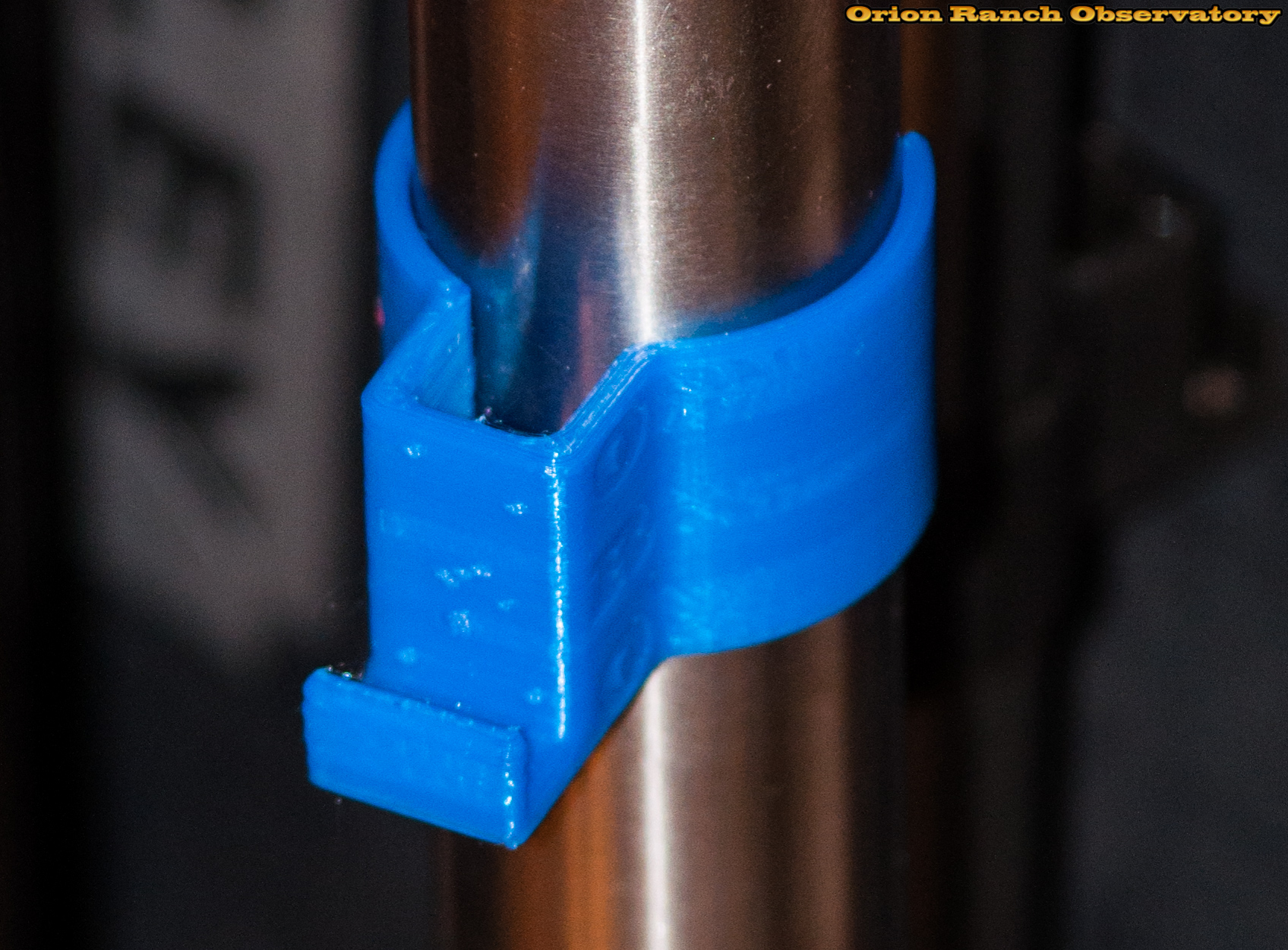 A new design for the hand control holder leg clips with a slot in them for power cord handling. Note the Orion Ranch Observatory ORO label and the Orion constellation.