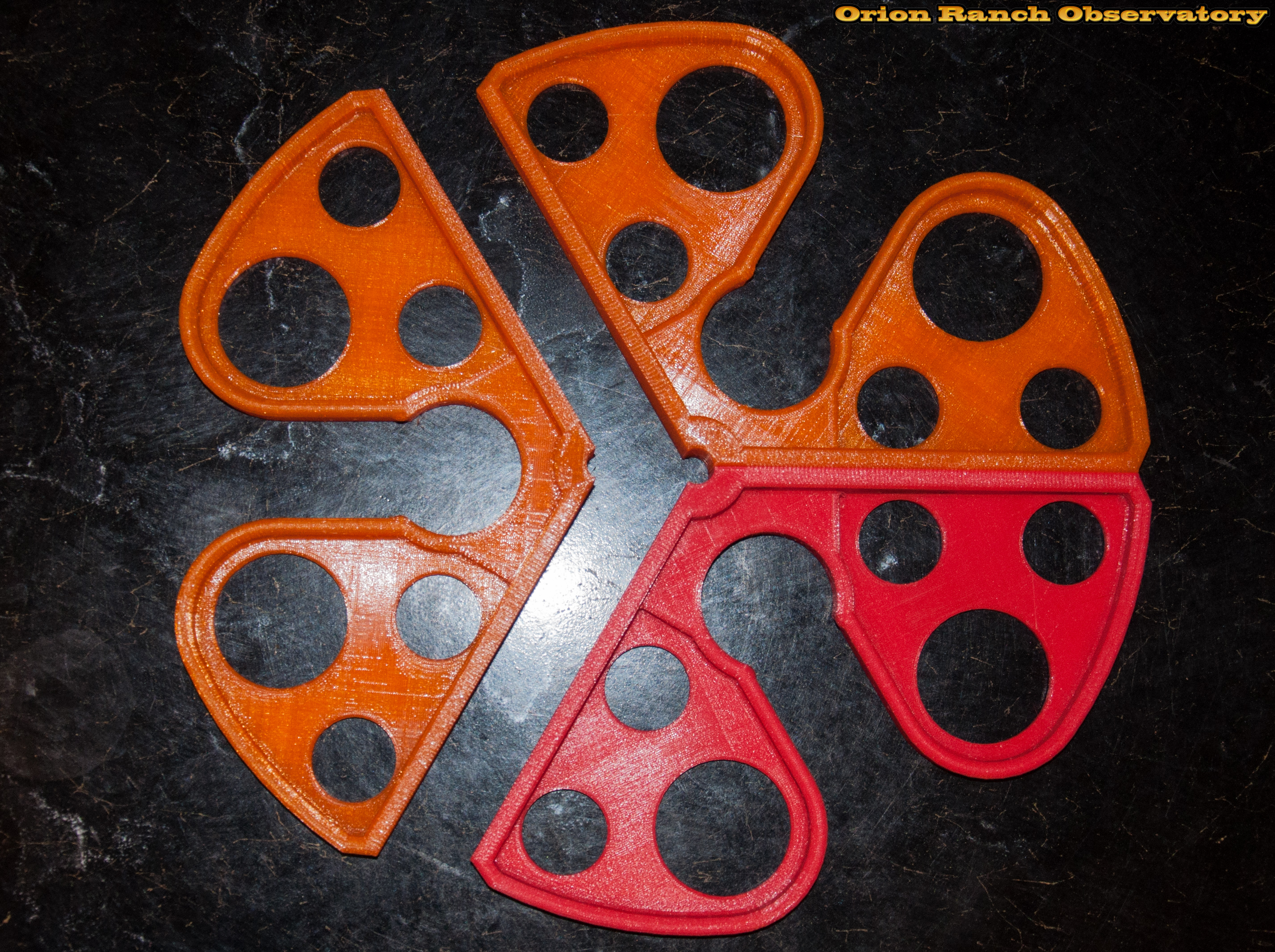 This design makes the center rib taller and thicker, and adds a rib all around the rim to prevent any mishaps there with the eyepiece holders. Instead of the clips. this uses three machine screws and nuts per joint ($1 at Walmart) utilizing the thickness of the clip in the part itself. Rather than the one-piece center hole, each part has its own rib, and the perimeter rib attaches to the center around the 2" slot.