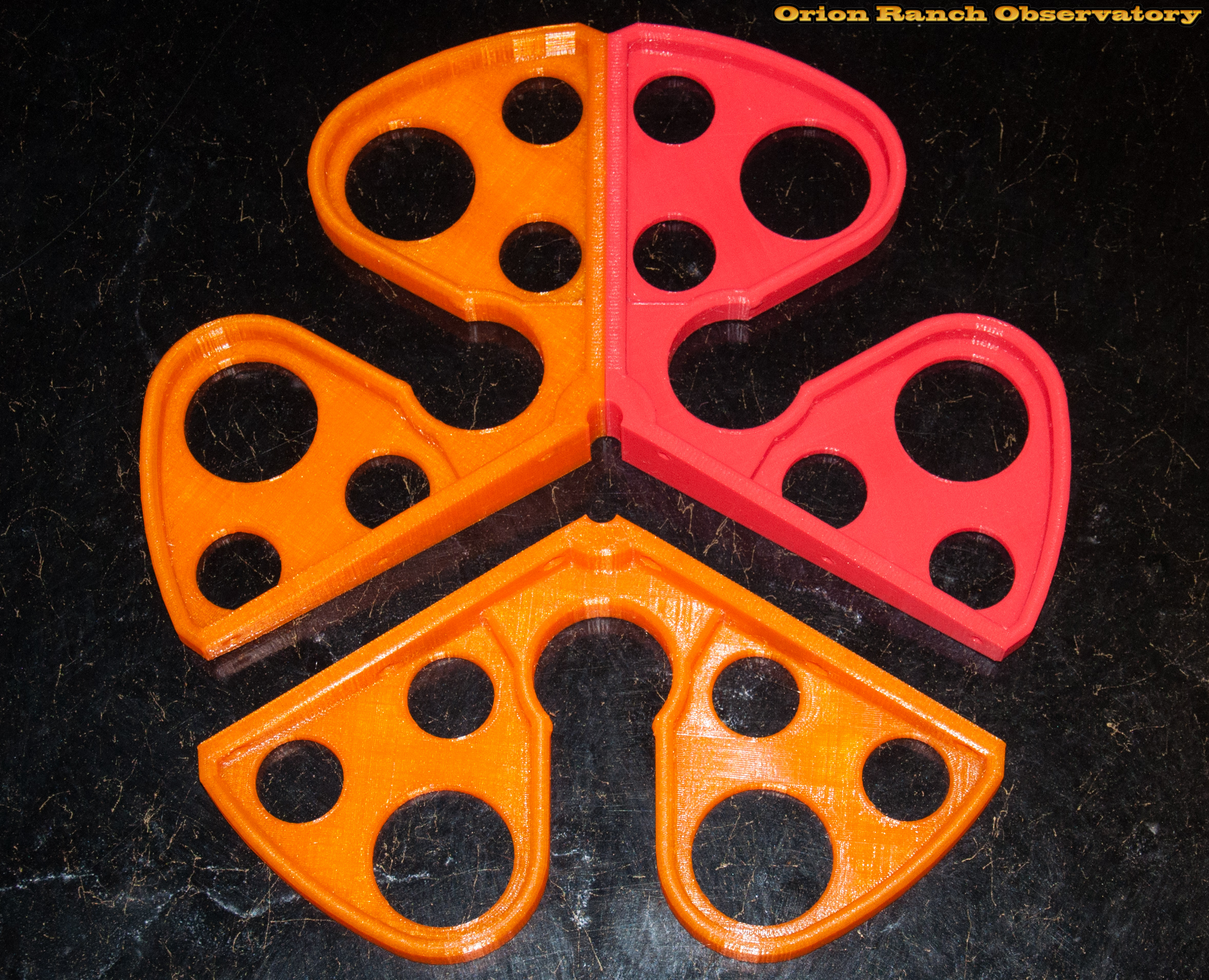 This design makes the center rib taller and thicker, and adds a rib all around the rim to prevent any mishaps there with the eyepiece holders. Instead of the clips. this uses three machine screws and nuts per joint ($1 at Walmart) utilizing the thickness of the clip in the part itself. Rather than the one-piece center hole, each part has its own rib, and the perimeter rib attaches to the center around the 2" slot.