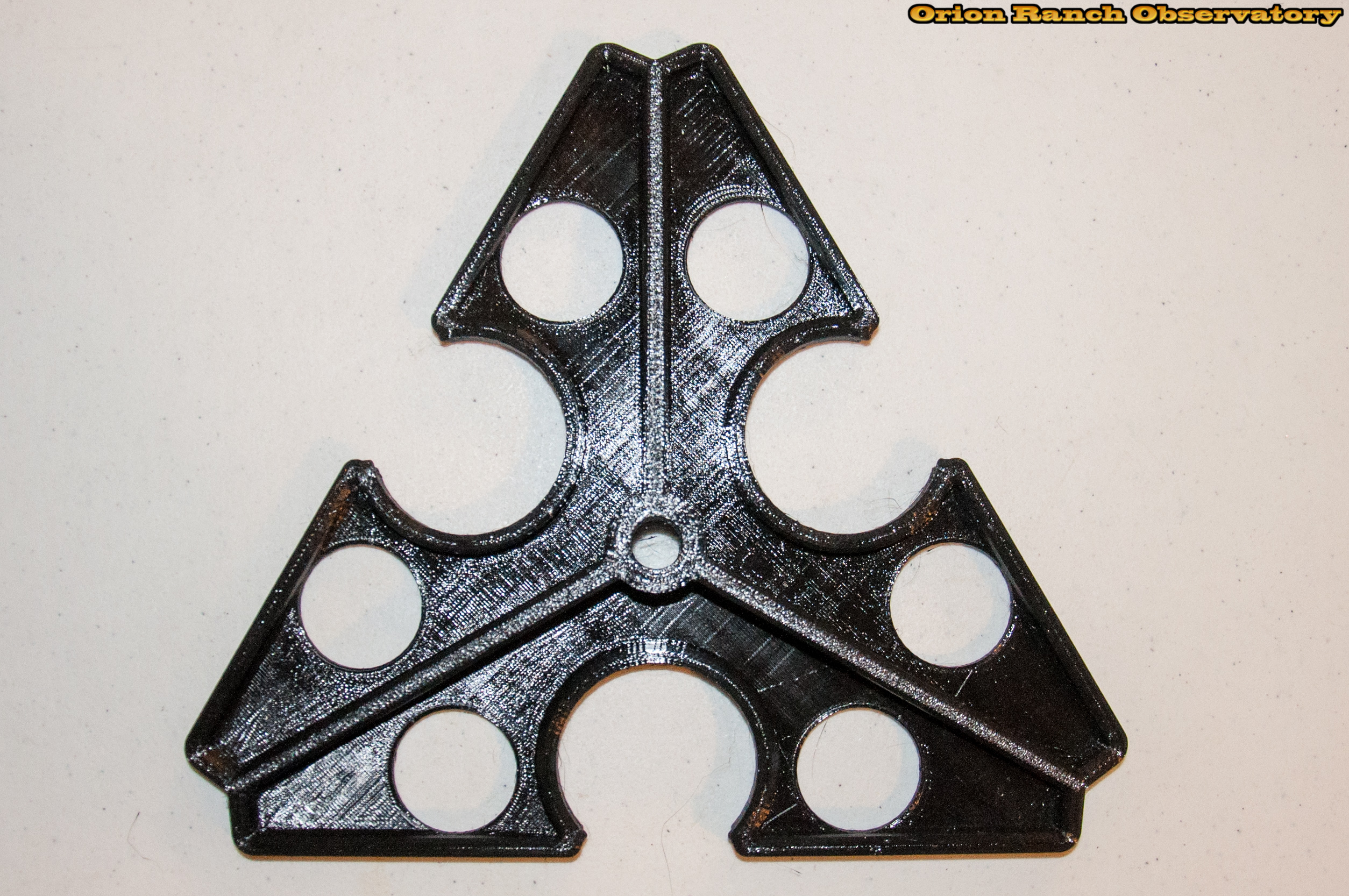 This is the latest revision of the delta spreader (really about the fifth revision) adding a reinforcement rib around the perimeter, as well as increasing the height of the main ribs slightly. The edges are also chamfered to provide a nice finished look. Printing with a raft to keep the parts flat provides a semi wood textured surface, providing a high friction surface.