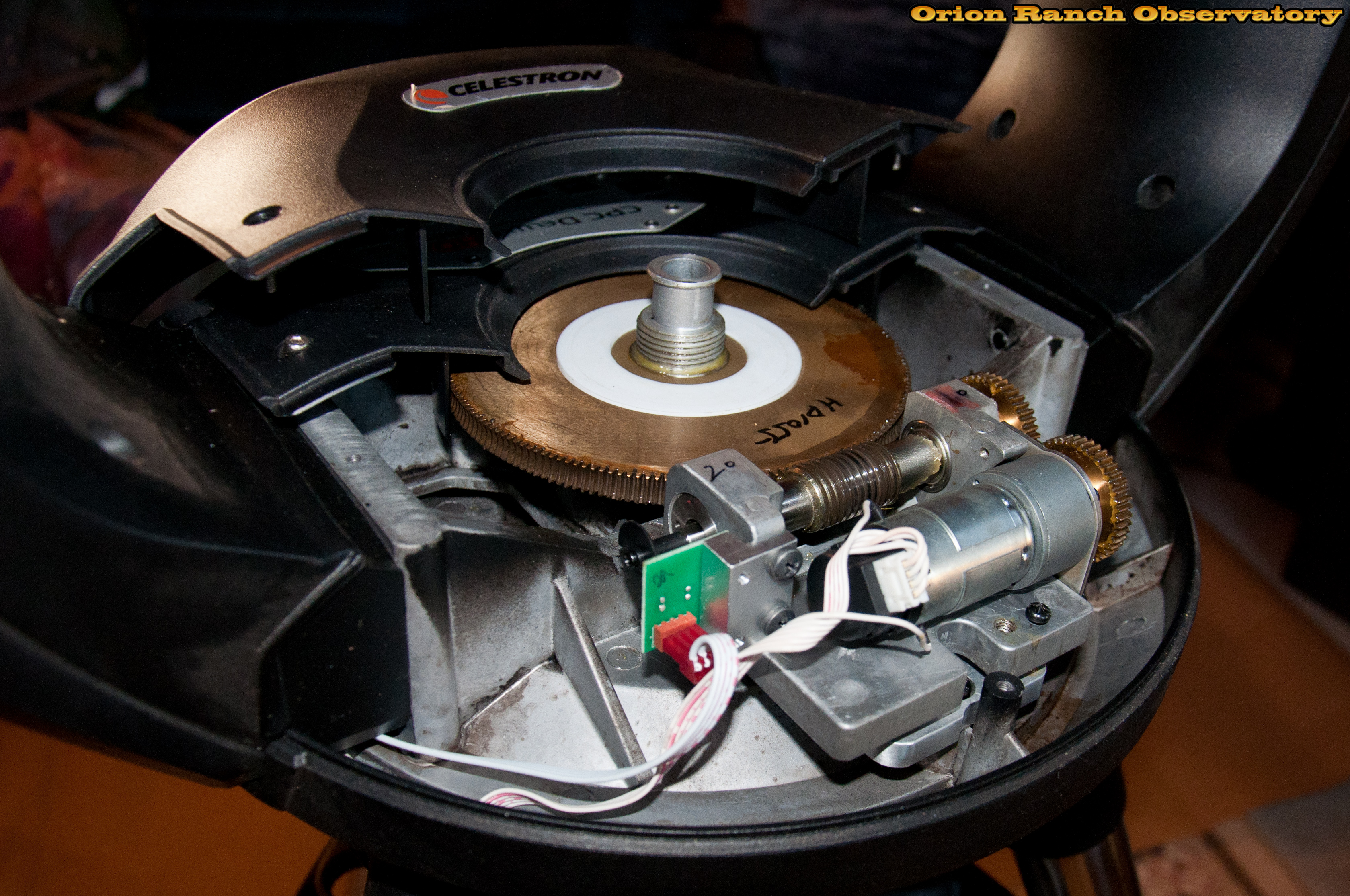 The spur gear servo motor drive turns the worm gear on the far side. You can see the black encoder on the back of the servo and the PEC reference sensor on the main worm gear shaft. The spur gears connecting the motor to the output shaft are typically covered with a shroud. Not sure why my unit doesn't have it. Also not sure why they need a 1:1 gear vs. finding the space to direct drive the worm and eliminate that additional point of play.
