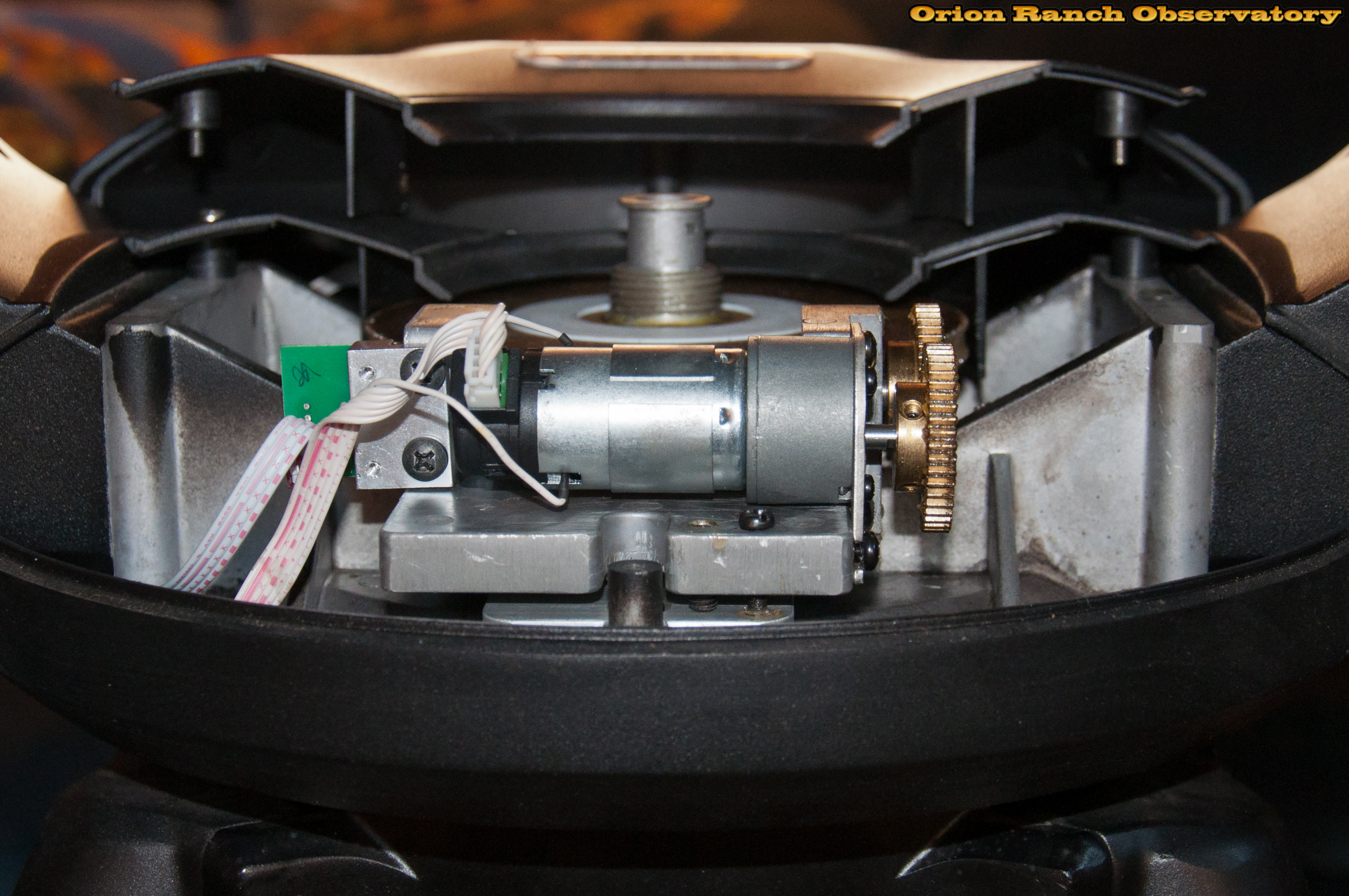 The spur gear servo motor drive turns the worm gear on the far side. You can see the black encoder on the back of the servo and the PEC reference sensor on the main worm gear shaft. The spur gears connecting the motor to the output shaft are typically covered with a shroud. Not sure why my unit doesn't have it. Also not sure why they need a 1:1 gear vs. finding the space to direct drive the worm and eliminate that additional point of play.