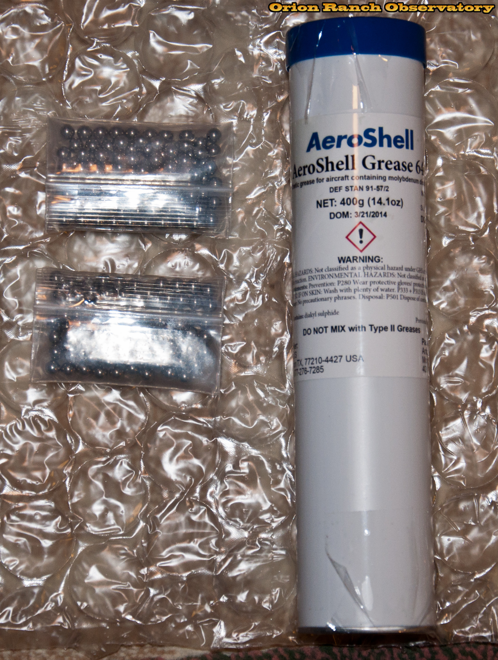 Using AeroShell 64 Molybdenum grease, which is a high end aircraft grease with a broad range of operating temperatures and is suitable for high pressure applications. The 1/4" bearings are stainless steel.