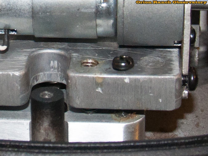 Yep, those are the tensioner range adjustment screws for the RA drive. Unlike the declination axis, there is no pressure adjustment of the spring. Instead you're just adjusting the range of motion of the carrier. Loosening the black screw lets the worm gear ride deeper in the spur gear, while the set screw in the hole controls how far OUT of the teeth it can ride. While the declination axis can still skip teeth if too much force is applied, this screw prevents the RA axis from skipping teeth. However, it doesn't increase the spring pressure.