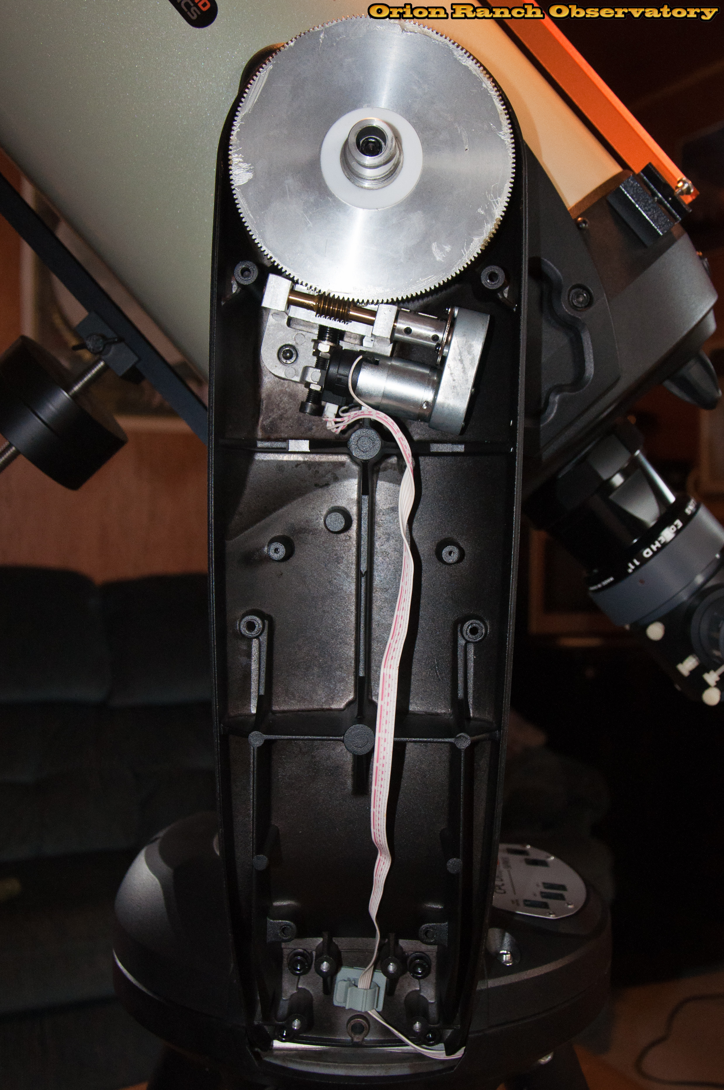 Inside the drive fork, showing the servo, gearbox, and worm gear.