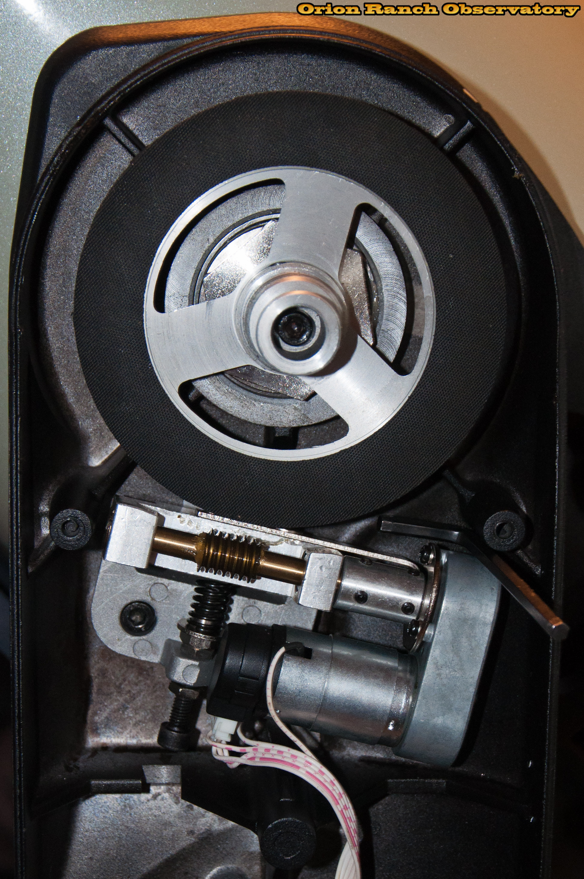 After slipping the main worm gear off the clutch plate, you can see the rubber sheet on an aluminum assembly that appears identical to the azimuth axis clutch plate.