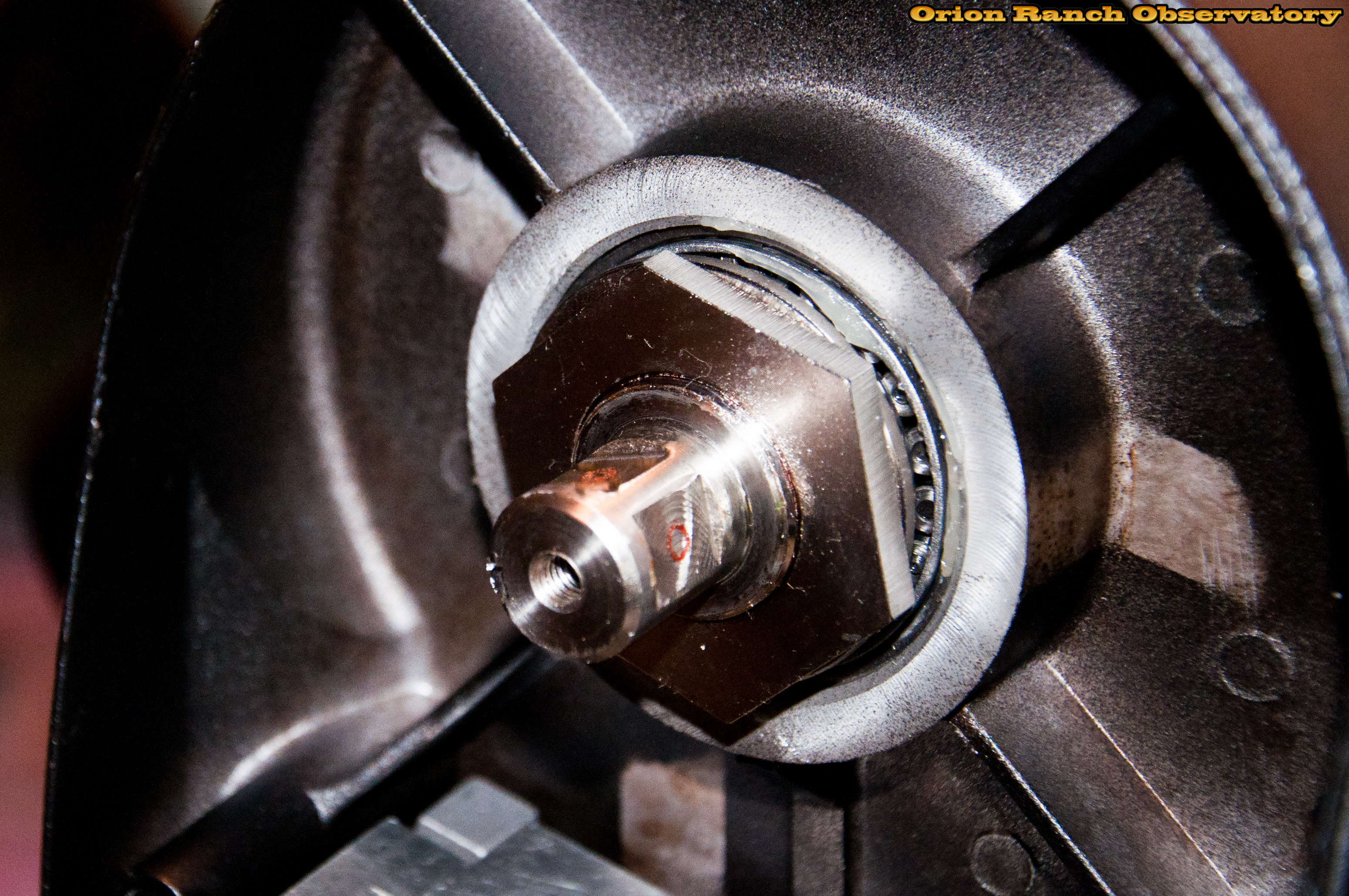 The declination/elevation axis has the same two flats and key for attaching the clutch plate.