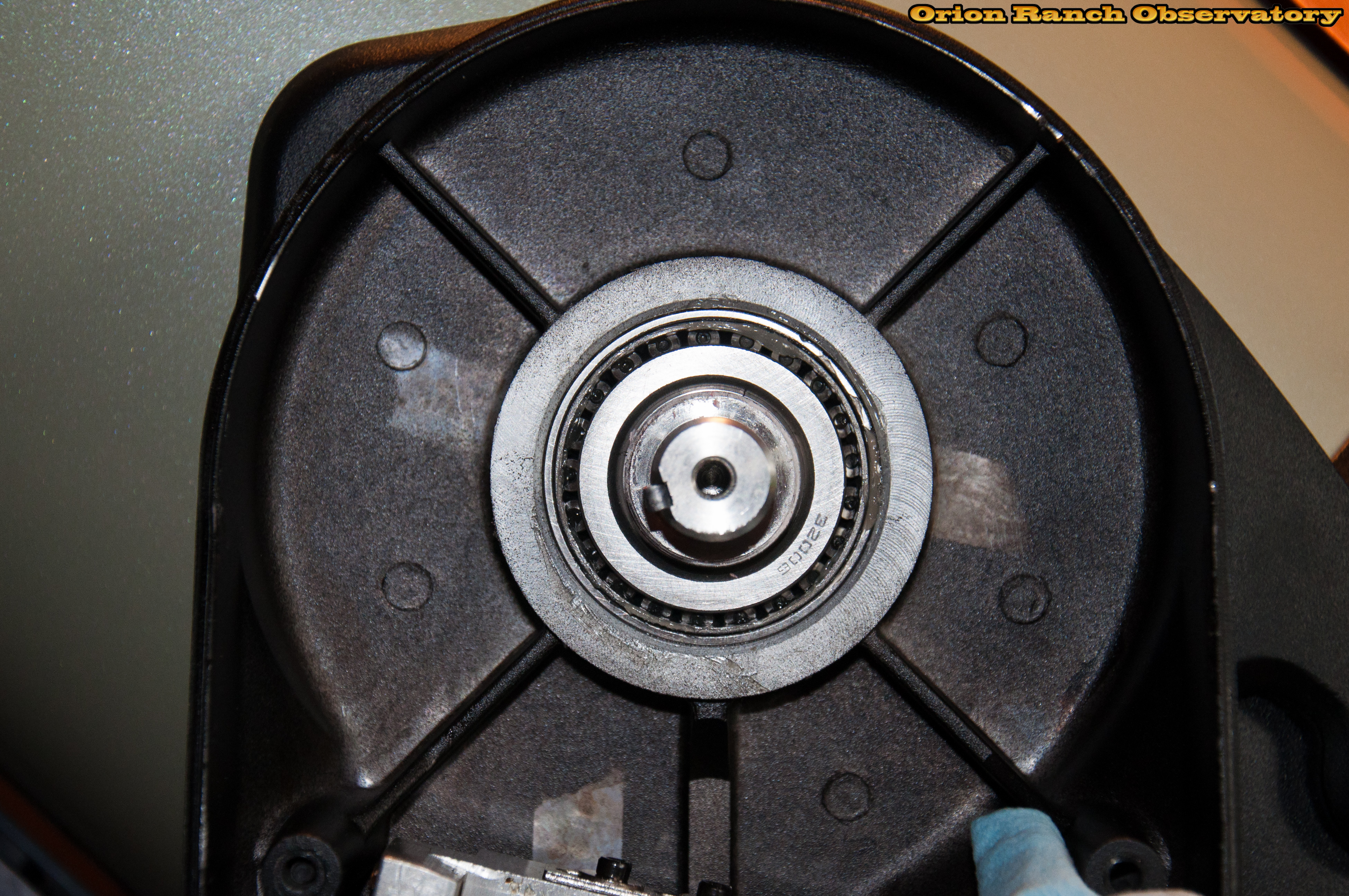 After removing the nut and washer, the same thrust bearing as the azimuth axis is visible.