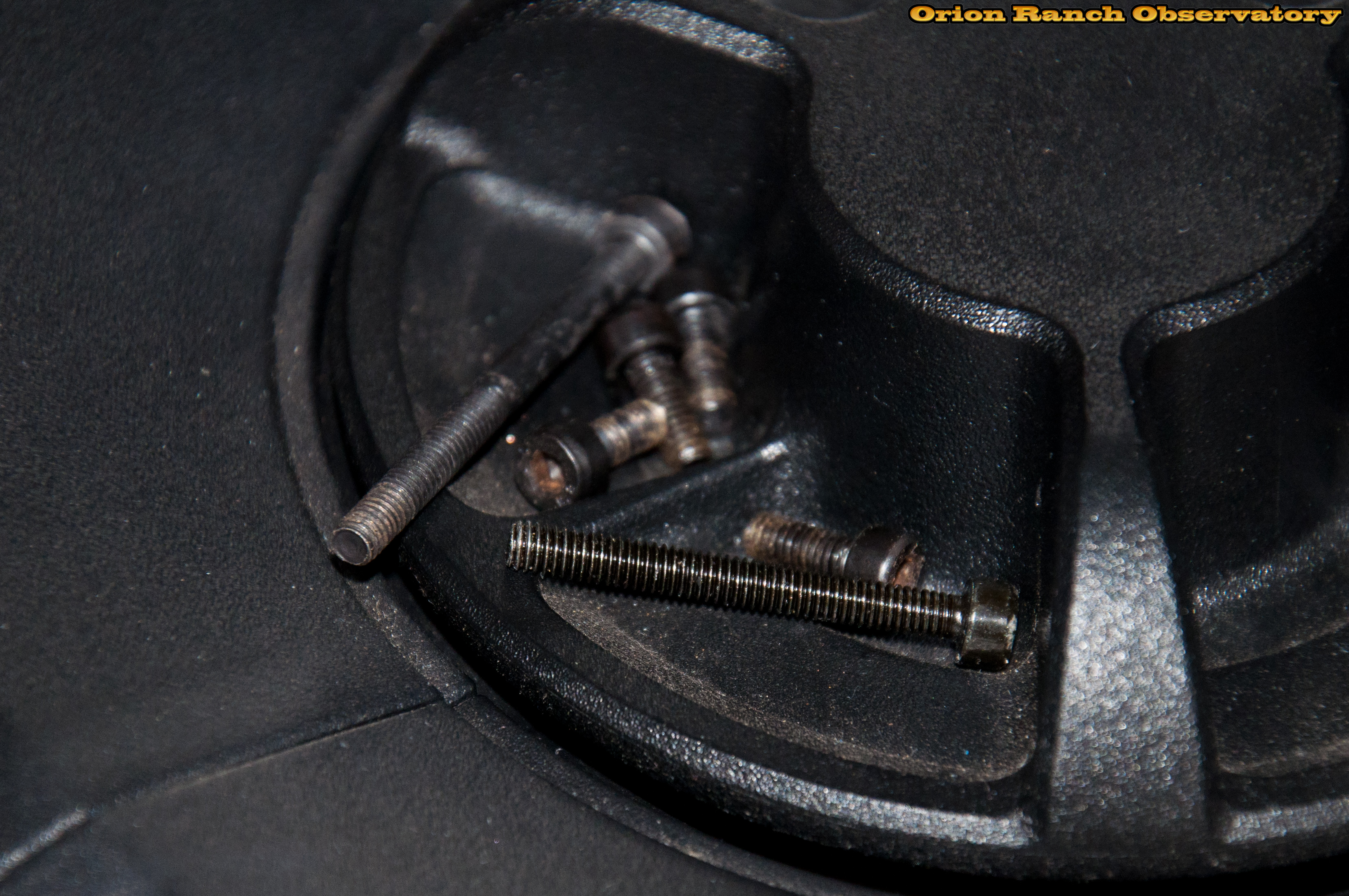 Six screws, four short and two longer ones up near the OTA, hold the plastic outer cover from the inside.