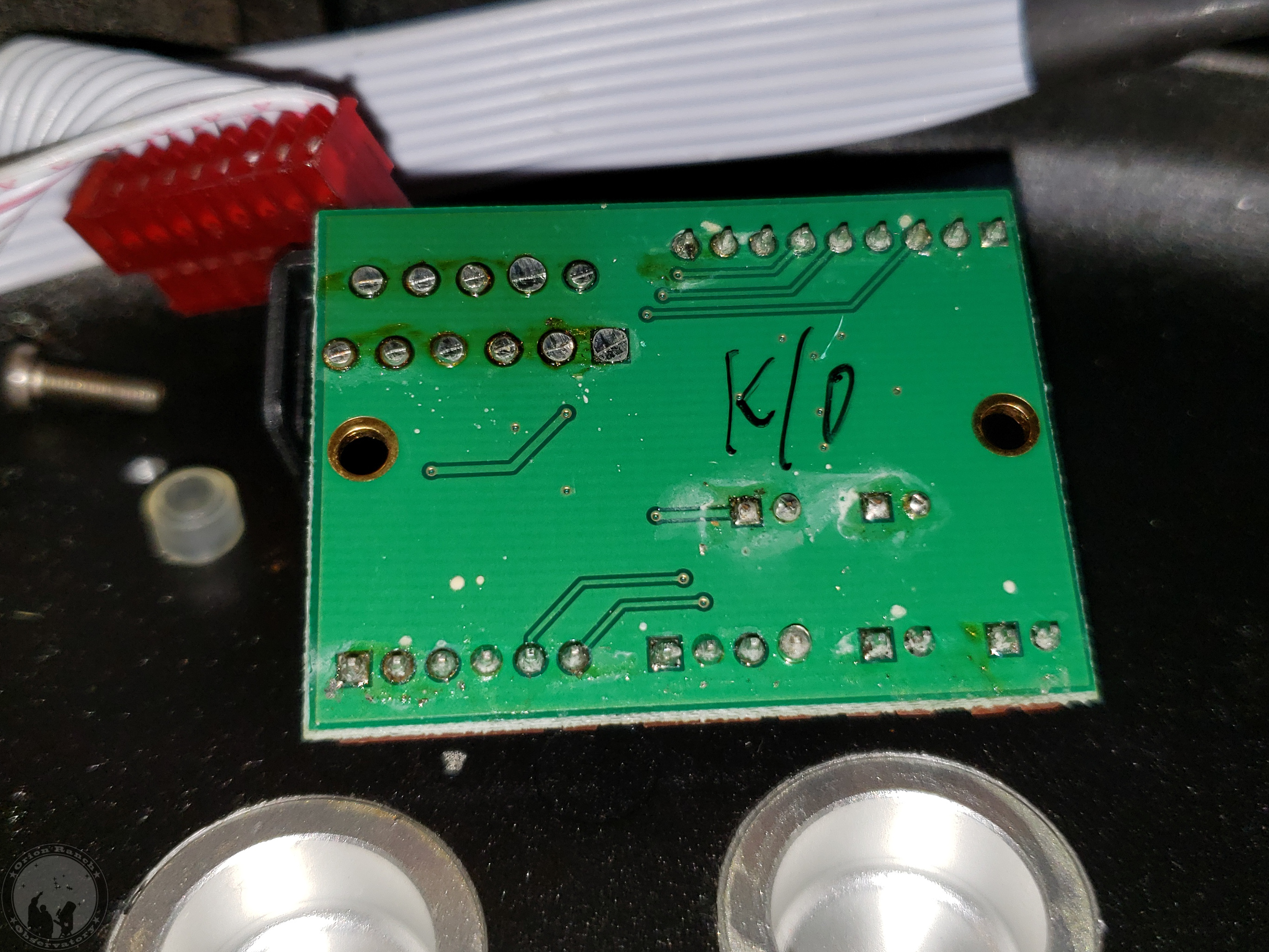 View of underside of motor driver PCB showing apprent desolder residue around capacitor leads.