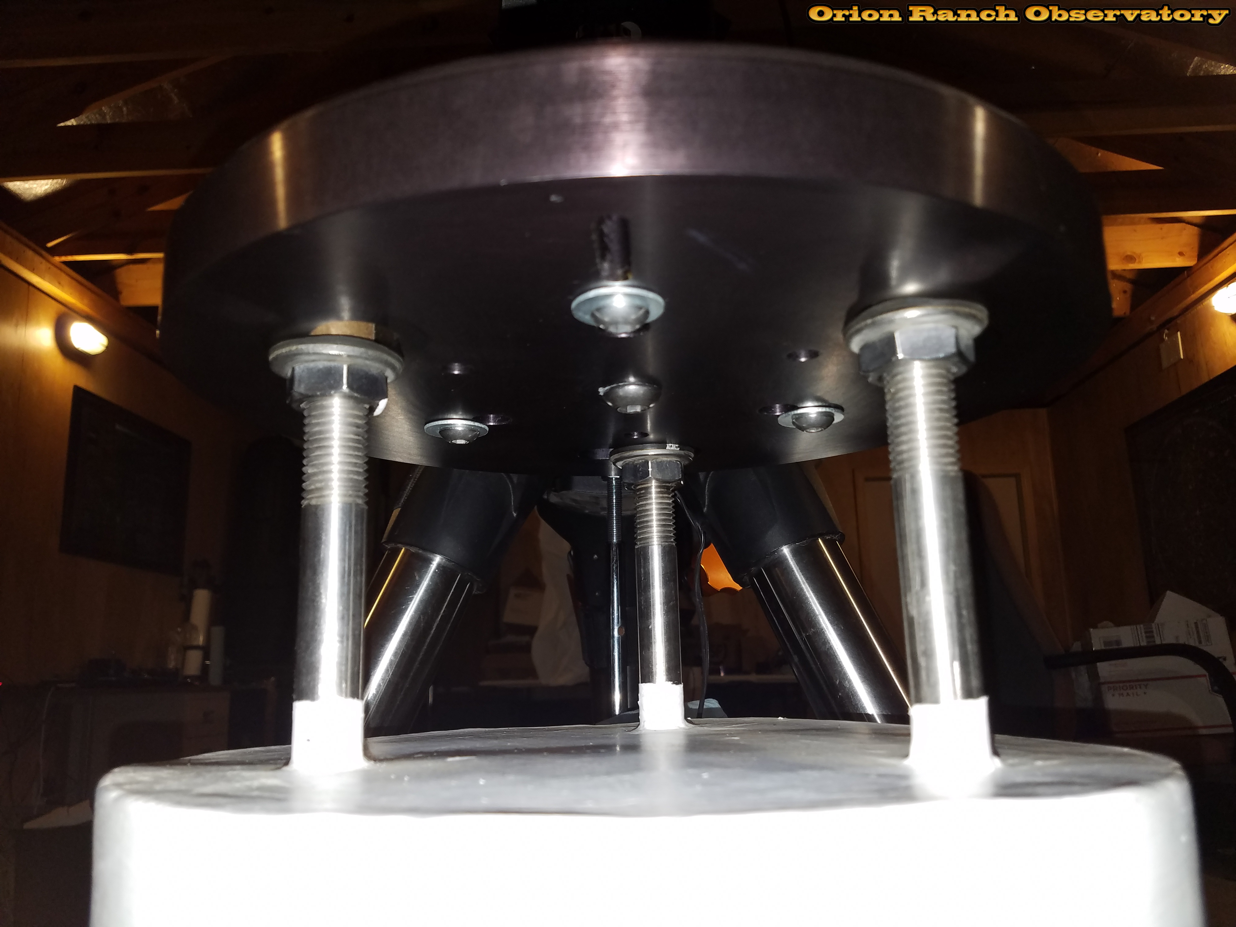 Various views of the new pier plate adapter installed on the 12" pier plate. I only had my cell phone with me, so the pictures aren't the greatest. Note the badly faded pier plate from before completing the observatory. Also note that I had to add washers to the screws as they were bottoming out in the holes and not clamping the plate down. The previous pier plate used shoulder bolts.