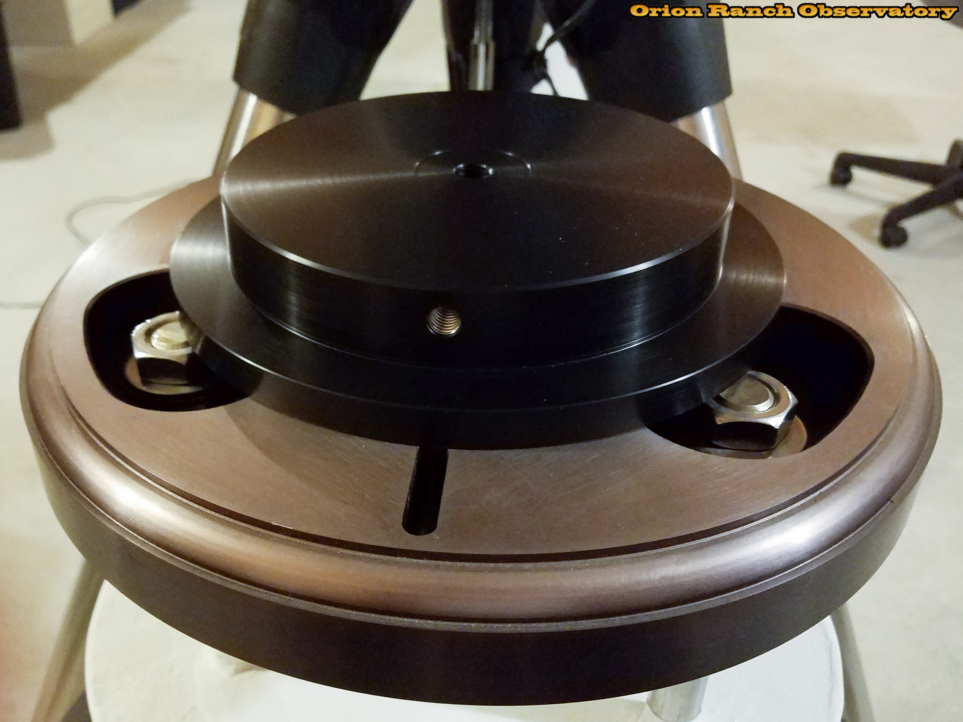 Various views of the new pier plate adapter installed on the 12" pier plate. I only had my cell phone with me, so the pictures aren't the greatest. Note the badly faded pier plate from before completing the observatory. Also note that I had to add washers to the screws as they were bottoming out in the holes and not clamping the plate down. The previous pier plate used shoulder bolts.