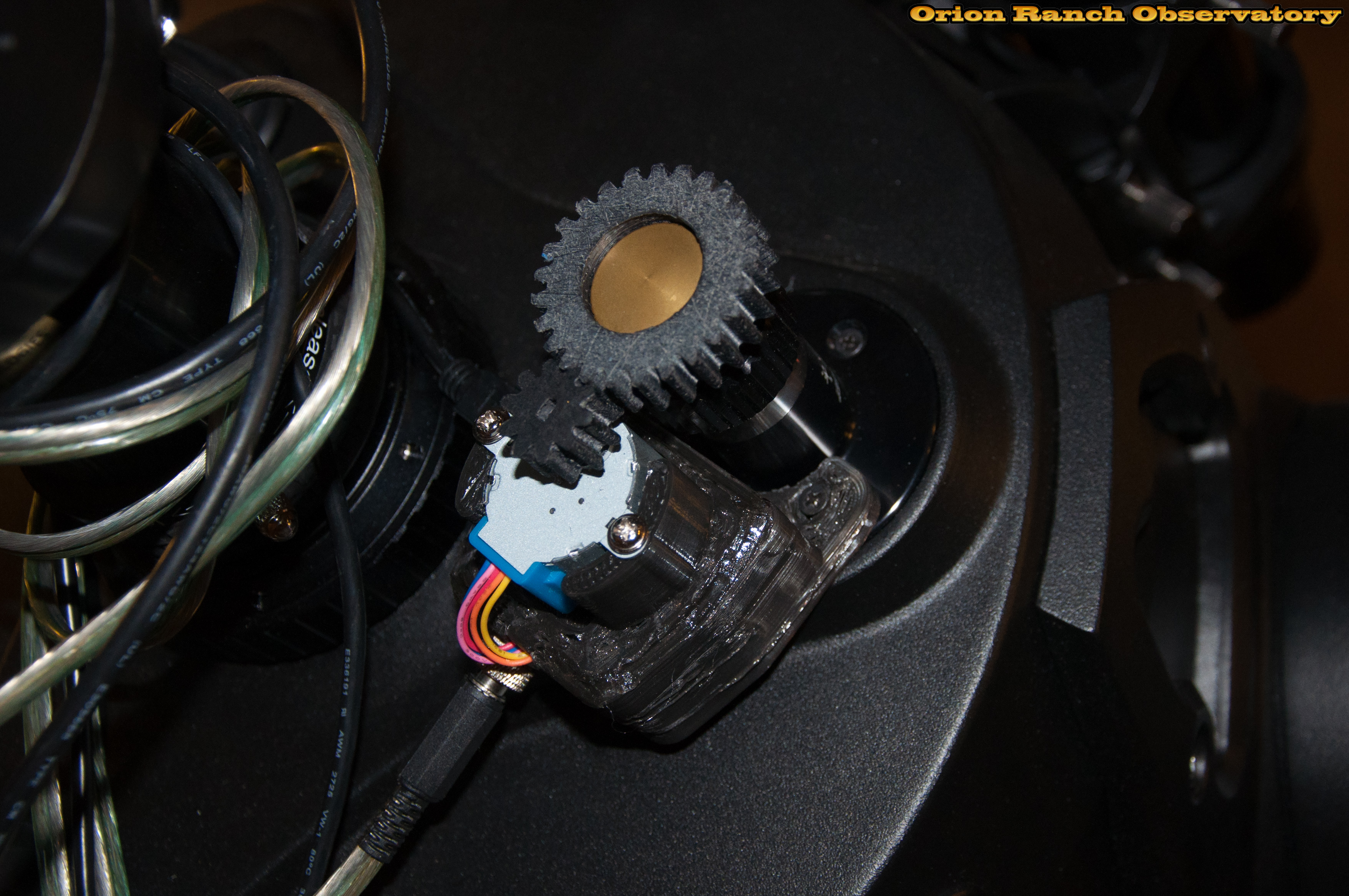 The focus motor mounts using two of the three screws on the Celestron focuser and uses two printed gears to drive the fine (10x) focus knob on a FeatherTouch focuser.