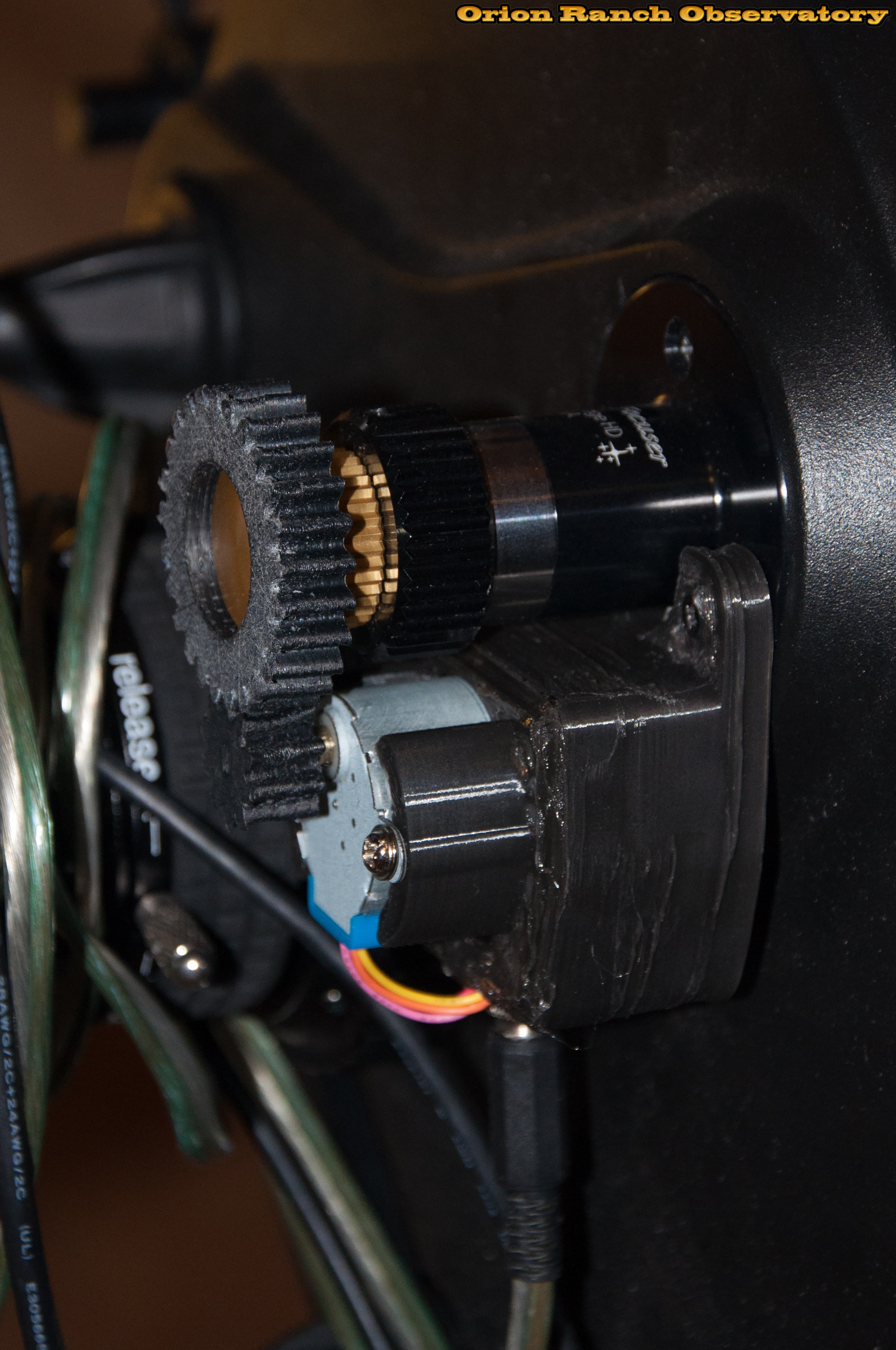 The focus motor mounts using two of the three screws on the Celestron focuser and uses two printed gears to drive the fine (10x) focus knob on a FeatherTouch focuser.