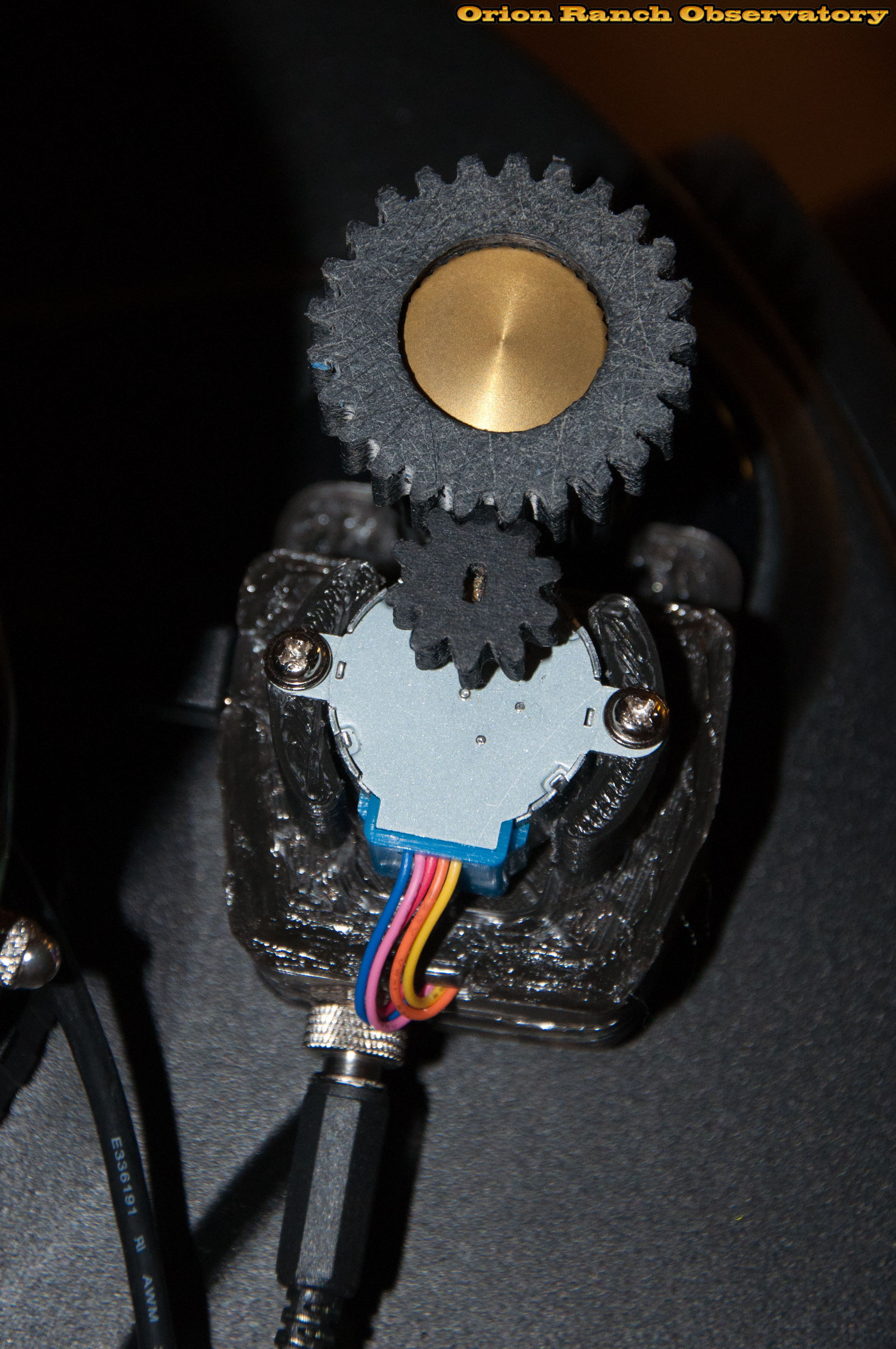 The focus motor mounts using two of the three screws on the Celestron focuser and uses two printed gears to drive the fine (10x) focus knob on a FeatherTouch focuser.