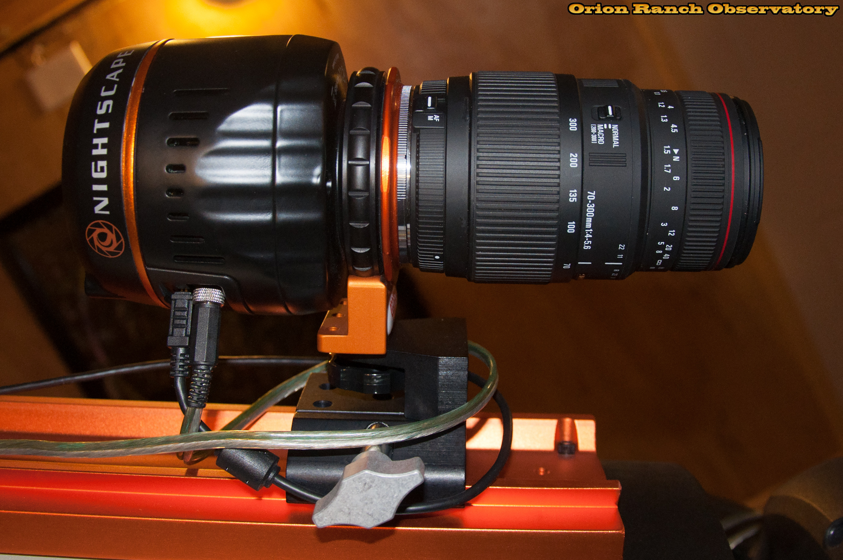 Various views of my Sigma70-300 mm Nikon mount lens and Celestron Nightscape mounted on the adapter with the lens at the 70 mm setting. Unfortunately there's no rotation for the T-ring mount, so the camera ends up at whatever orientation you get.