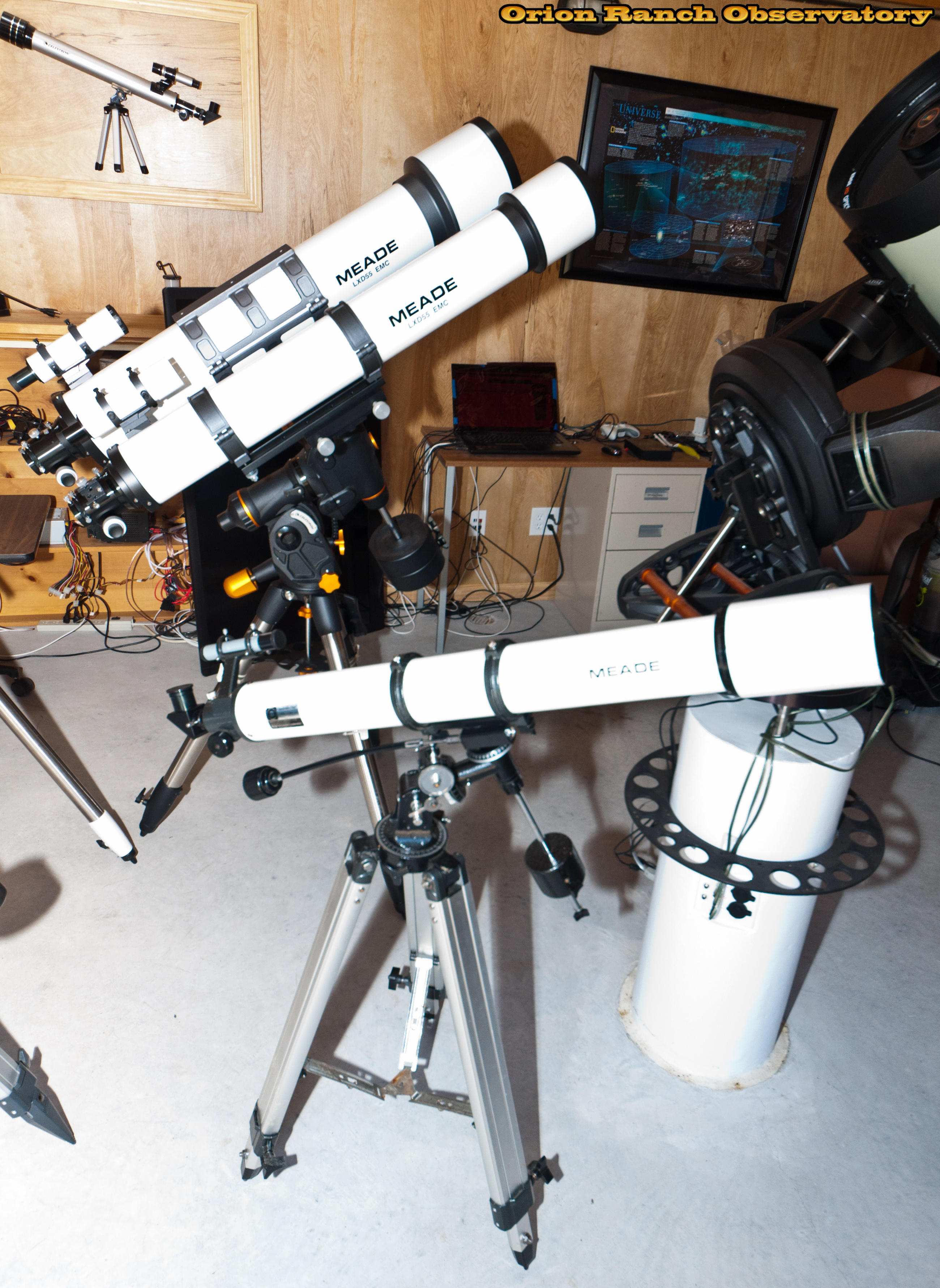 A collection of three Meade refractors, an old 3", a 5", and a 6".