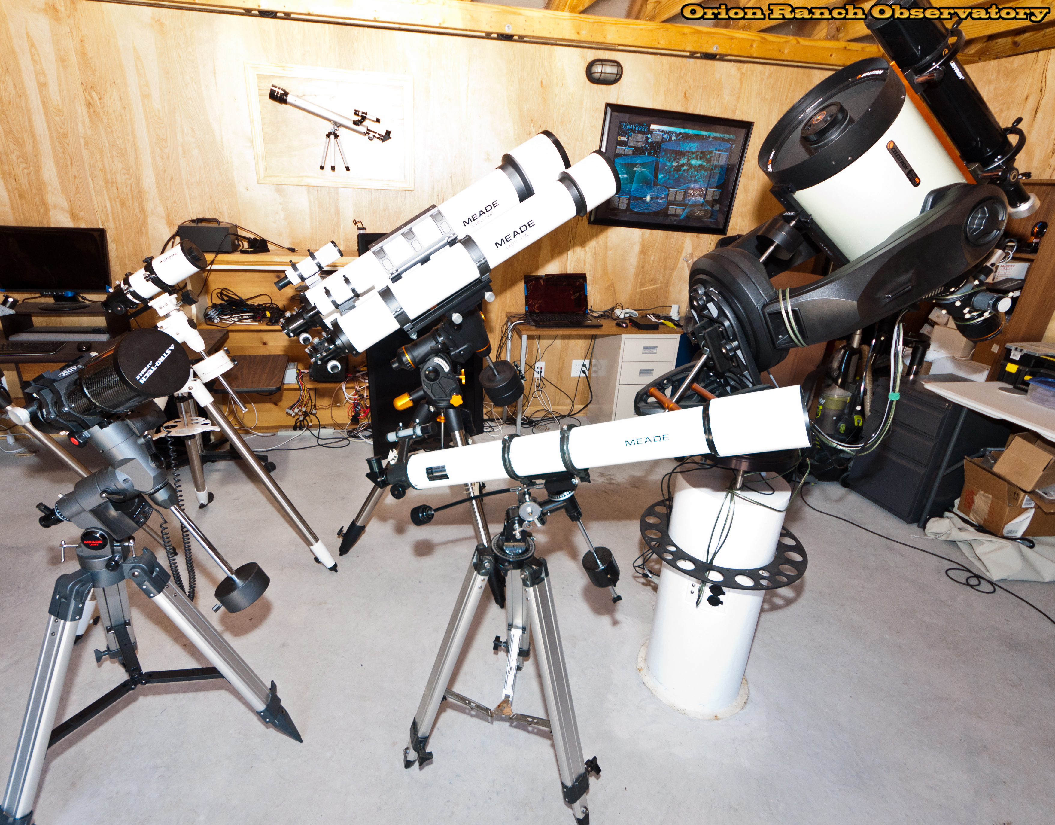 A collection of three Meade refractors, an old 3", a 5", and a 6".