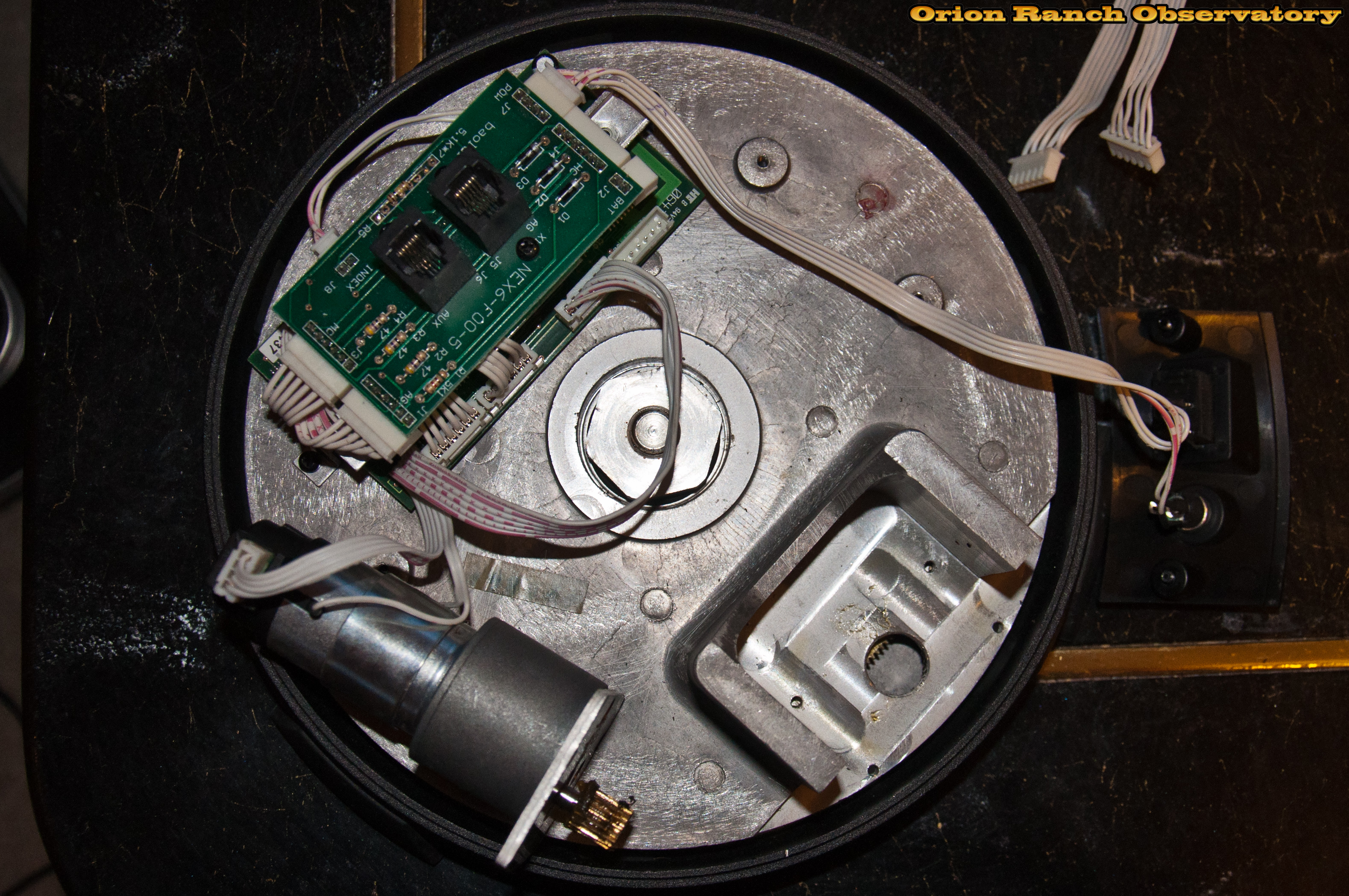 NexStar mount disassembled down to the base to gain access to the motor and drive spur gear. Note too the motor control board with the interface board on top. The design is very simple.