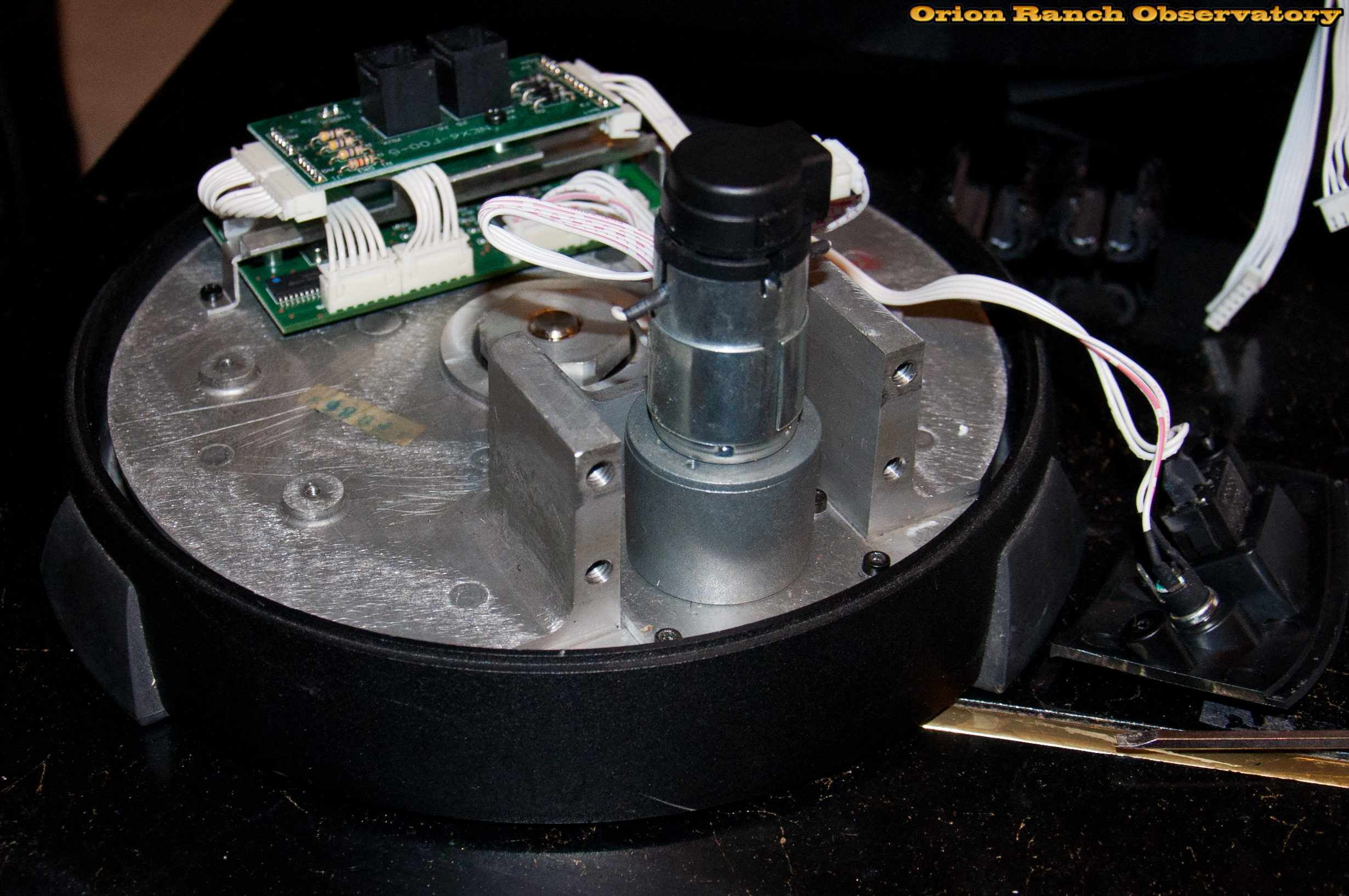 After re-installing the azimuth motor and pushing it tight to the spur gear to eliminate play in the azimuth axis. There's quite a bit of adjustment in the four screw holes. The drive is MUCH tighter now.