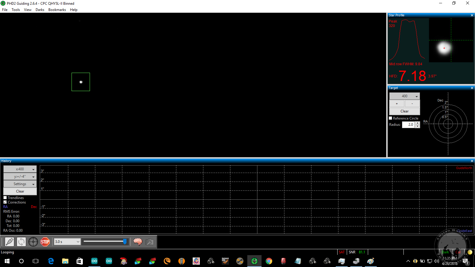 Test guider exposure with the old QHY5L-II at three seconds still showing only one star that's now saturated.