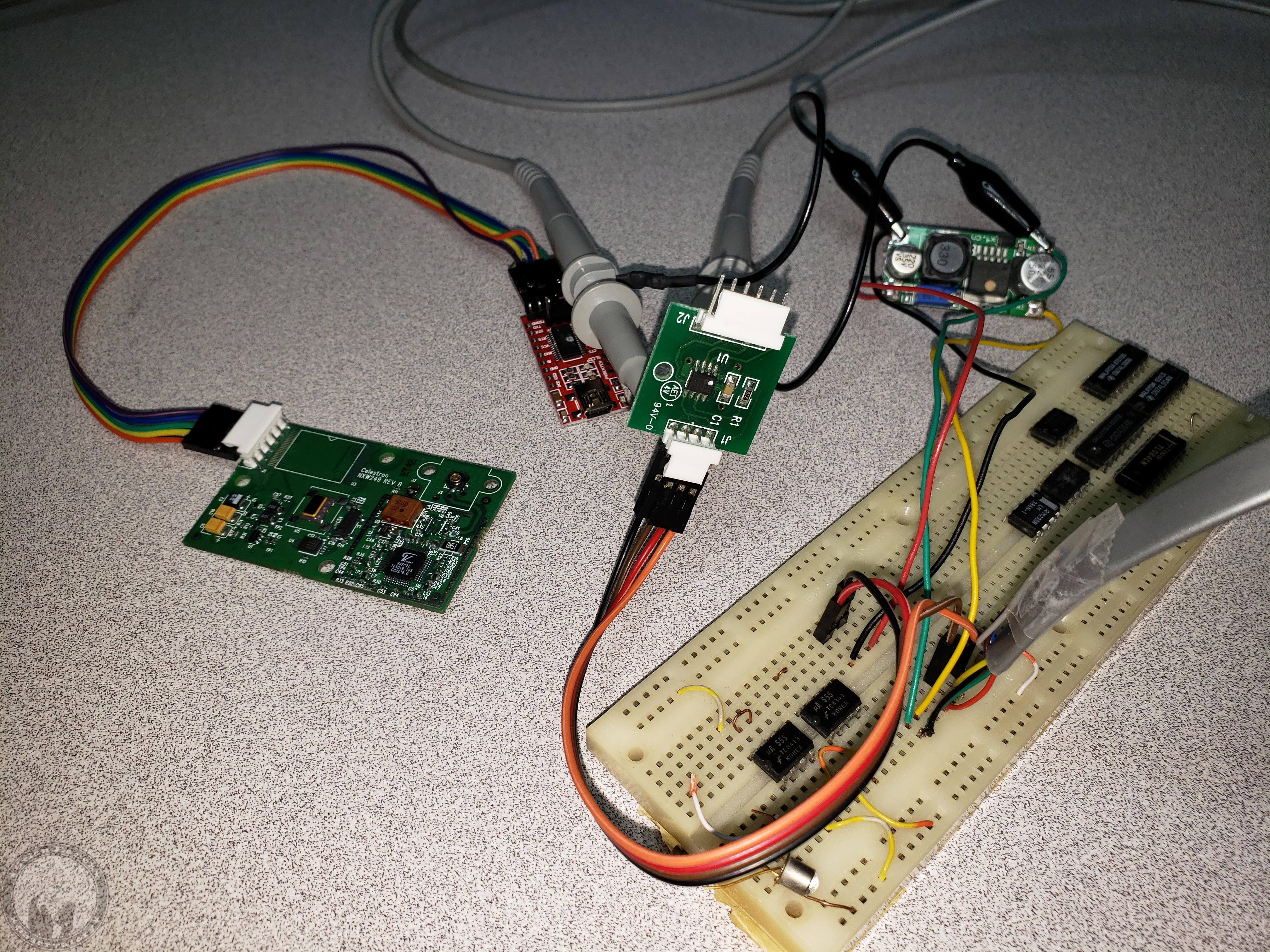 Rather than removing the NexStar GPS from the observatory, I rigged up a voltage regulator so I could plug the NXW434 into my NexStar 8SE mount. Ignore all the other chips stored on the breadboard.