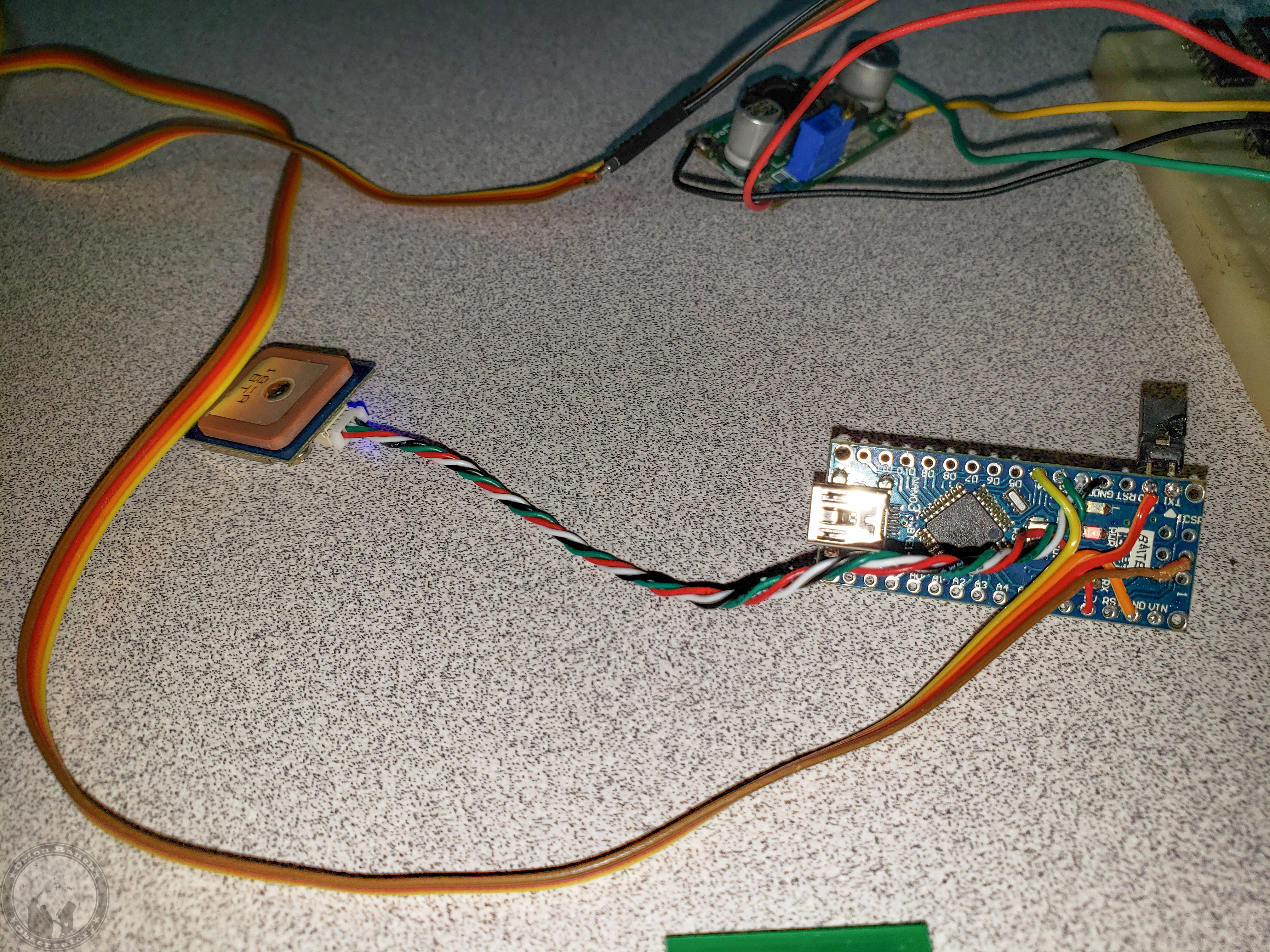 The BN-220 GNSS module on the left is connected to the Arduino Nano on the right. The jumper temporarily connects serial TX and RX pins.