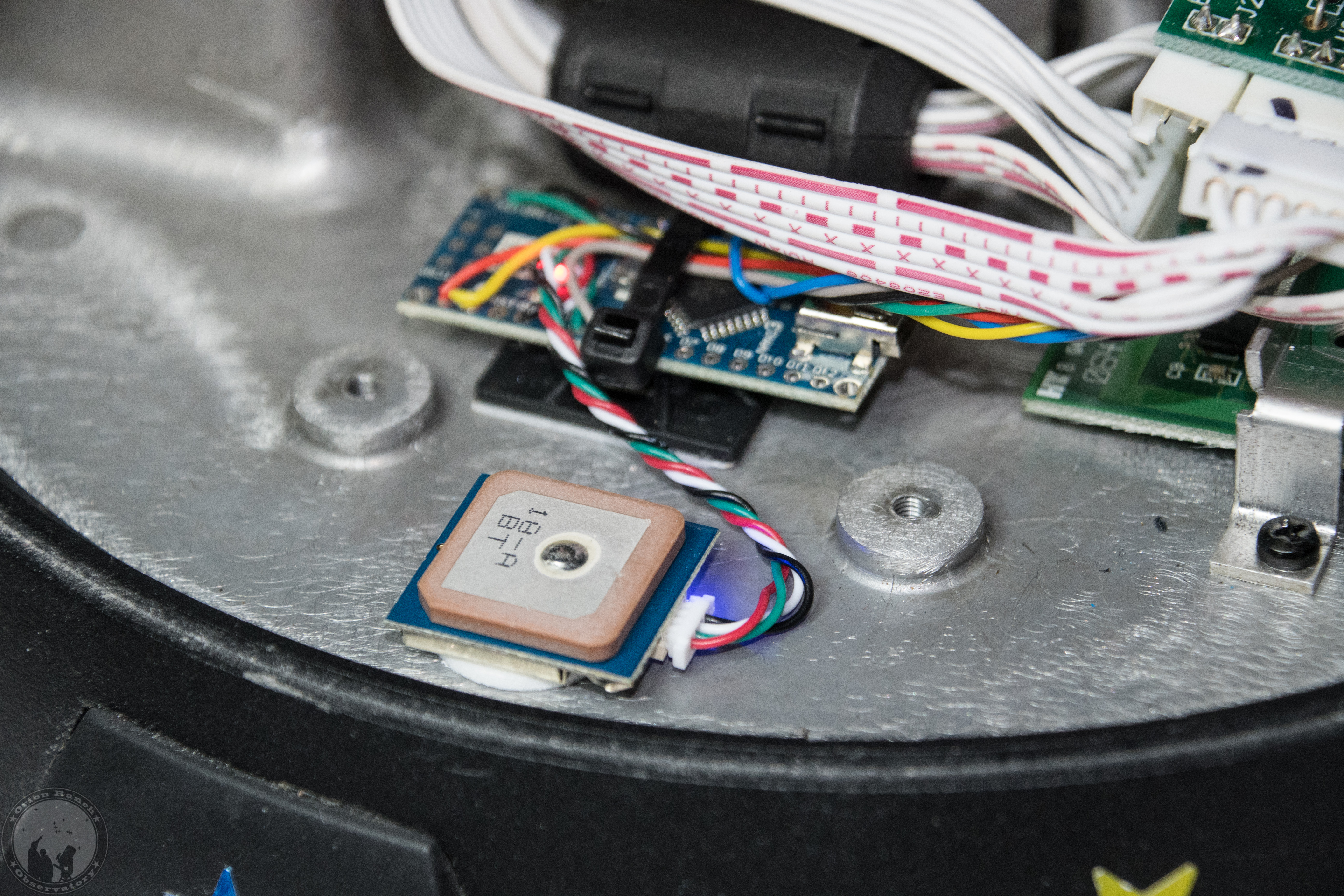 The GPS module is mounted on the 3M double-stick foam tape dot that came with the module. The Arduino Nano is strapped to a tie-wrap sticky tab.