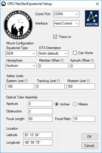 ORO NexStarEquatorial Setup Dialog 2