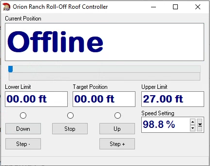 This is the Windows based application I've used to control my roll-off roof. It was based on the code I'd originally written to become the embedded Windows PC based controller for the positioning systems that I had developed at work and used for the roll-off drive system. That project got scrapped, but I had the code to use for this. I never got around to adding remote control or ASCOM support to it, and the serial interface, which was always a bit intermittent, finally failed on me.