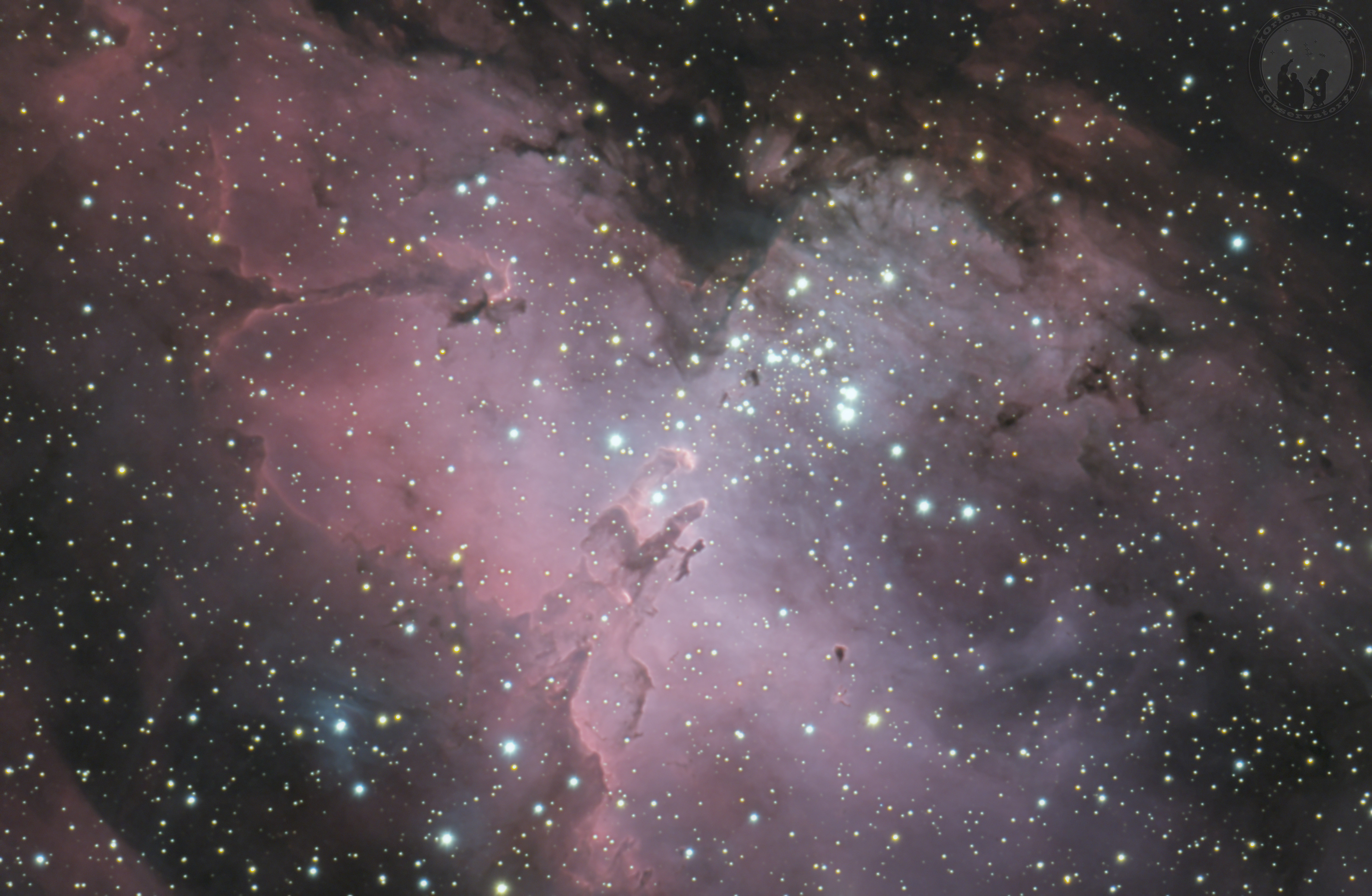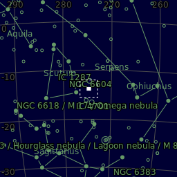 The Eagle Nebula (Messier 16 or NGC 6611), also known as the Star Queen Nebula or The Spire, is a relatively dim emission nebula around a young open cluster of stars in the constellation Serpens. The nebula contains several active star-forming gas and dust regions, including the "Pillars of Creation" area made famous in images by the Hubble Space Telescope. IC 4703 is the diffuse emission nebula or HII region associated with M 16. While the open cluster is easily identified through an average telescope, the nebula is only barely perceptible with a large aperture telescope in extremely dark skies.