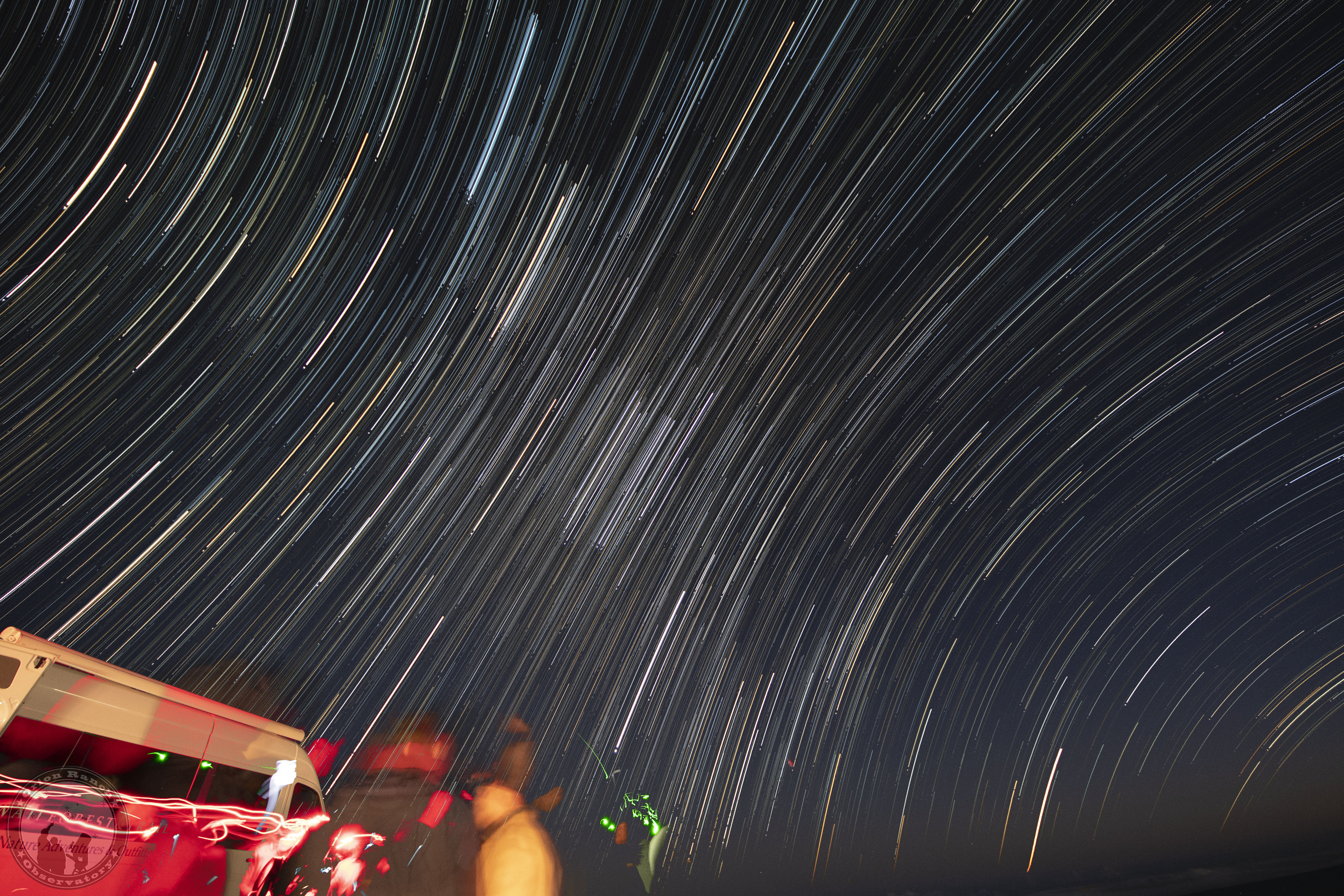 This star trails image was created from the entire stack of images for the entire time lapse. The neatest thing about this image is that it has both North and South polar curves, with straight lines along the equator. Very cool!