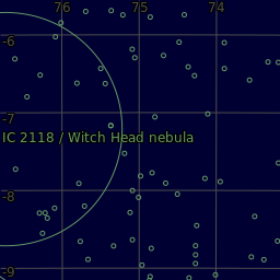 Principal objects in field: Adara (εCMa), California nebula, IC 2118, IC 353, IC 360, NGC 1499, Part of the constellation Carina (Car), Part of the constellation Cetus (Cet), Part of the constellation Dorado (Dor), Part of the constellation Eridanus (Eri), Part of the constellation Horologium (Hor), Part of the constellation Perseus (Per), Part of the constellation Pictor (Pic), Part of the constellation Puppis (Pup), Part of the constellation Reticulum (Ret), The constellation Auriga (Aur), The constellation Caelum (Cae), The constellation Canis Major (CMa), The constellation Canis Minor (CMi), The constellation Columba (Col), The constellation Fornax (For), The constellation Gemini (Gem), The constellation Lepus (Lep), The constellation Monoceros (Mon), The constellation Orion (Ori), The constellation Taurus (Tau), The star Adhara, The star Aldebaran (αTau), The star Bellatrix (γOri), The star Betelgeuse (αOri), The star Canopus (αCar), The star Capella (αAur), The star Pollux (βGem), The star Procyon (αCMi), The star Rigel (βOri), The star Sirius (αCMa), Witch Head nebula